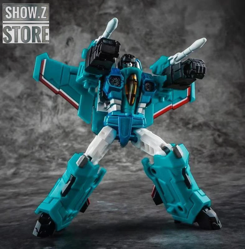 Iron Factory – Wing of Tyrant IF-EX20K Kallaite is recolored in the teale seeker jet color scheme. This figure is legends scale and transforms from seeker jet to robot and back.Â
