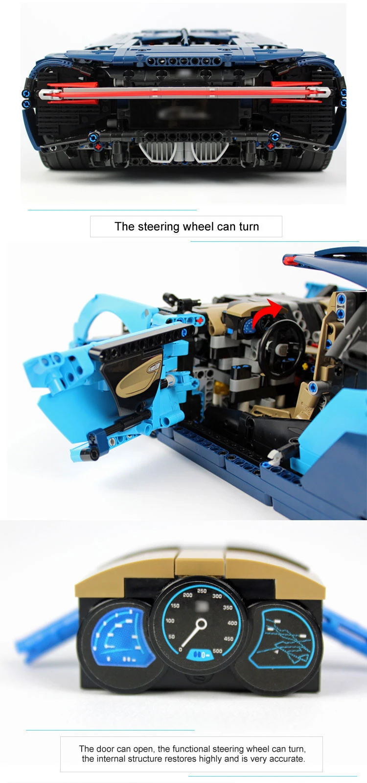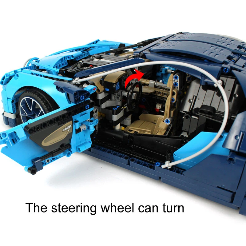 – Open the doors to access the detailed cockpit featuring a LEPIN Technic 8-speed gearbox with movable paddle gearshift and a steering wheel bearing the Bugatti emblem.